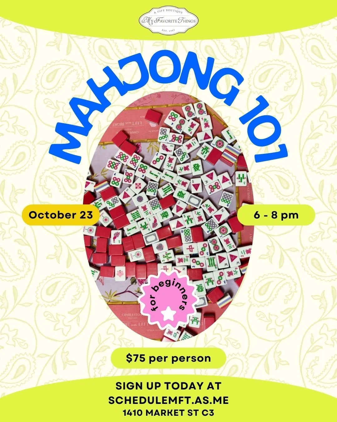 Join My Favorite Things for open play Mahjong every Monday at 10:30 AM, 12:30 PM, and 2:30 PM. Tiles and mats are provided. Bring your own 2025 card. Sign up at schedulemft.as.me.